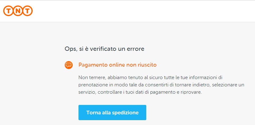 Il portale TNT in questo caso specifica che tutti i dati già inseriti sono stati conservati, minimizzando il disservizio. L´utente è quindi indotto a pensare che non un altro piccolo sforzo potrà completare l´acquisto.