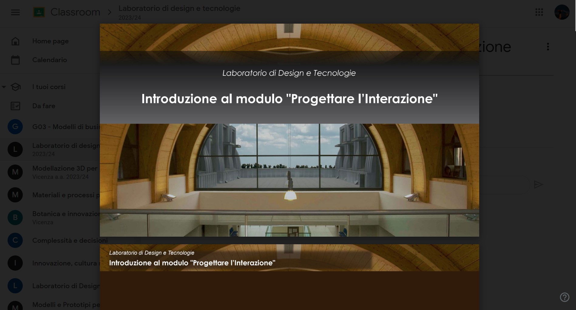 in fig. 4 classroom permette di aprire i pdf caricati nella stessa pagina web e scurendo lo schermo per focalizzare l’attenzione sul documento. Ciò permette una navigazione veloce del sito nel caso ci sia il bisogno di cercare un documento specifico.